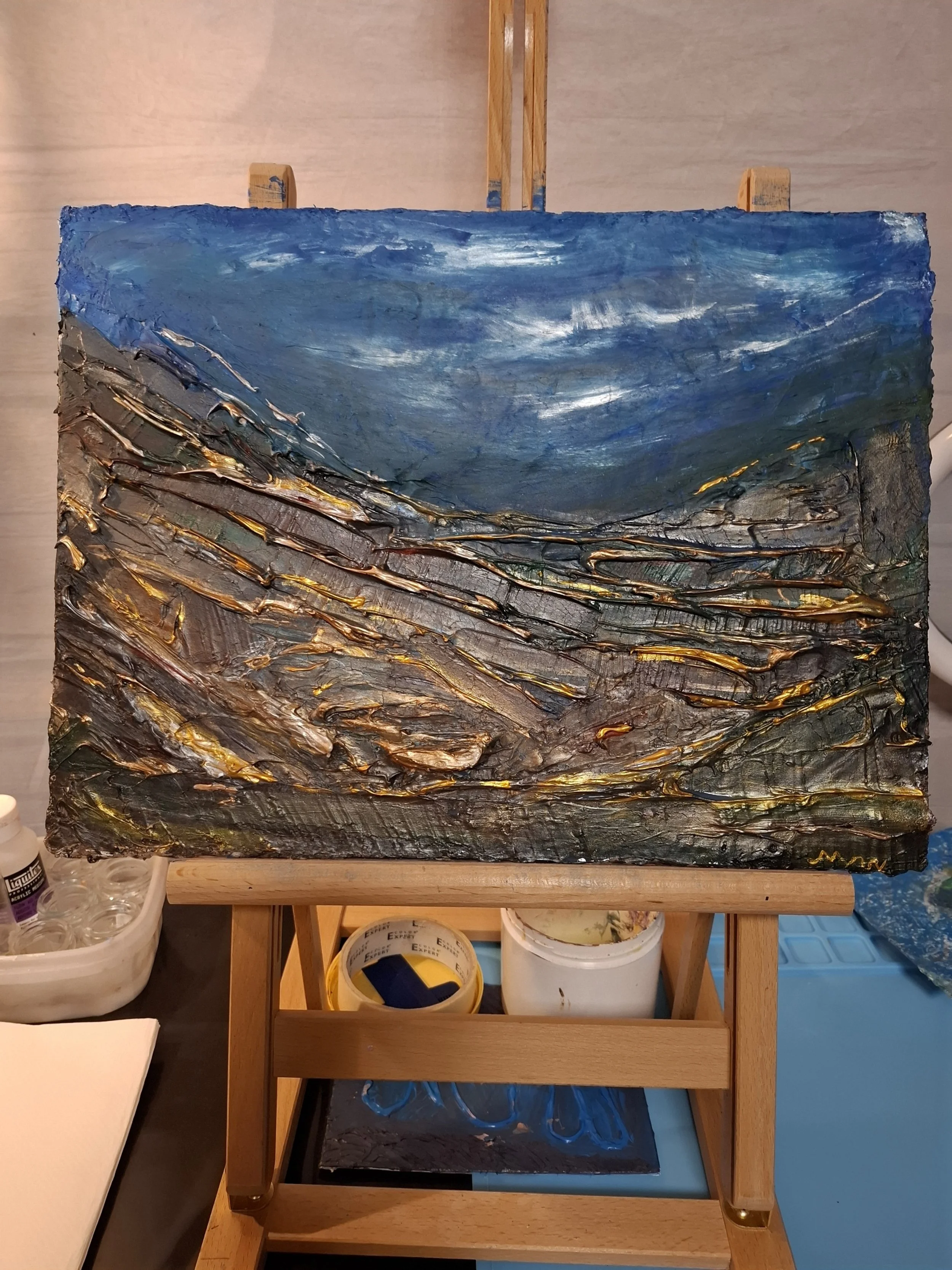 Prozessorientierte, materialbetonte Unikate – entstanden aus Acryl, Schichttechniken und experimentellen Oberflächen: Strukturpaste, Spachtelauftrag, Linien, Reliefs, Risse sowie ausgewählten Zusatzmaterialien und lichtreflektierenden Akzenten.